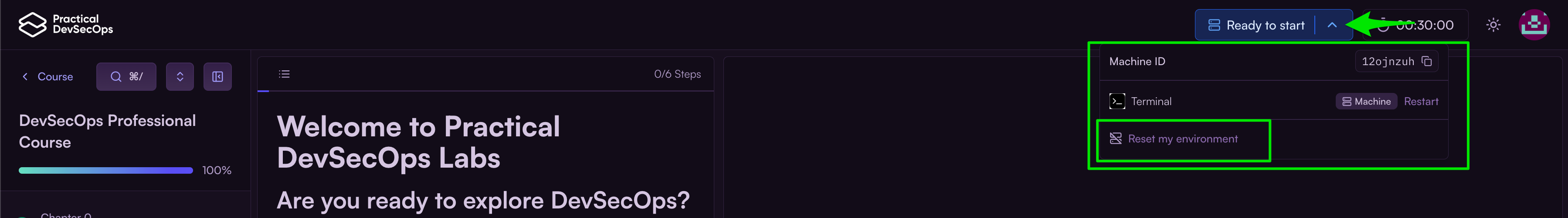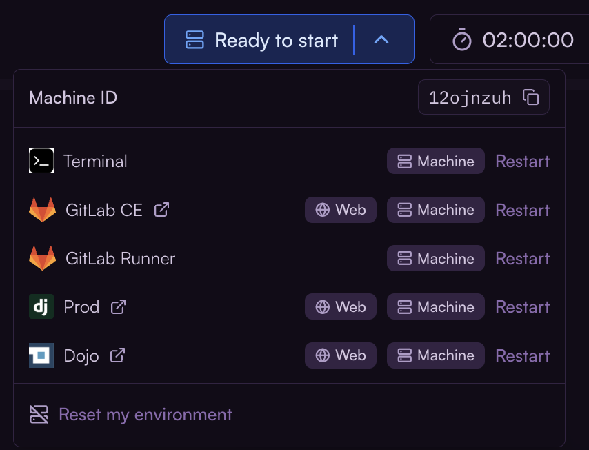 To reset a started or running terminal, click the arrow beside the timer and select Reset my environment.